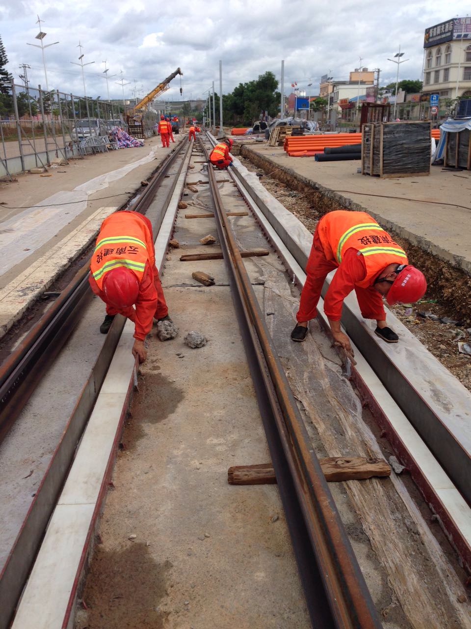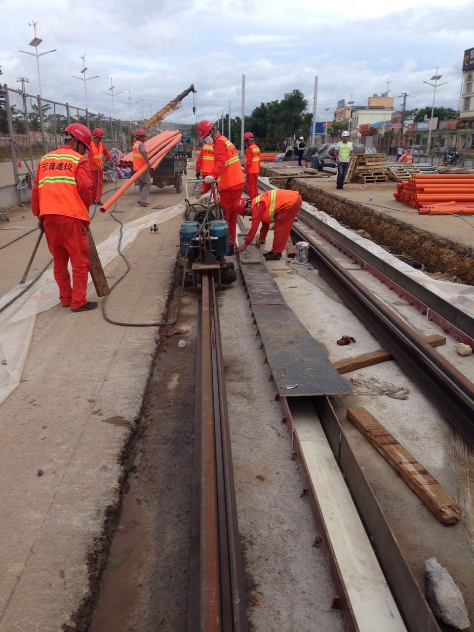 ? ? ? ? 供貨合同確定以后,軌道工程公司領導迅速組織技術、質量、供應、工程等相關部門就線路應用方案進行專題研究,人、機、料、法、測全部準備到位,2016年7月1日開始配合安裝公司進行安裝。截止到7月12日上午,雨過鋪左、右線各100米嵌入式軌道系統鋼制承軌槽已全部安裝完畢,目前正在通過監理驗收。同時,已順利完成高分子A、B料的取樣工作,并開始右線混凝土澆筑。