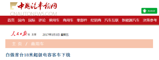 ? ? ? ?2月16日由新筑股份公司提供核心技術的首臺18米超級電容城市客車在白俄羅斯首都明斯克正式下線,不知近幾日大家是否也像小編一樣,從各大媒體看到了這條新聞報道~