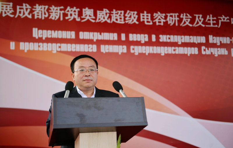 ? ? ? ?致辭結(jié)束后,四川省委常委、成都市委書記范銳平先生、中國駐白俄羅斯大使崔啟明先生、白俄羅斯經(jīng)濟(jì)部副部長馬圖謝維奇先生、中白工業(yè)園區(qū)管委會(huì)副主任伊格里先生、中白工業(yè)園合資公司總經(jīng)理李海欣先生和四川發(fā)展成都新筑股份黨委書記、董事長肖光輝先生共同為首批下線的超級(jí)電容產(chǎn)品進(jìn)行剪彩。在全場嘉賓熱烈的掌聲中,成都新筑奧威超級(jí)電容研發(fā)及生產(chǎn)中心正式投產(chǎn)運(yùn)營及產(chǎn)品下線儀式落下帷幕。