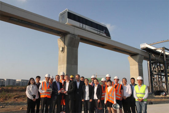 卡爾·弗雷勒先生一行登上了新筑股份中低速磁浮試驗登車平臺,參觀了磁浮工程樣車運行,聽取了項目情況介紹。