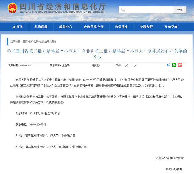 為深入貫徹習近平總書記關于“培育一批‘專精特新’中小企業”的重要指示精神,工業和信息化部于近日完成了第五批專精特新“小巨人”企業培育和第二批專精特新“小巨人”企業復核工作,四川省經濟和信息化廳于7月14日對我省通過審核的企業名單予以公示,成都市新筑交通科技有限公司(以下簡稱“新筑交科”)成功入選第五批國家級專精特新“小巨人”企業名單。