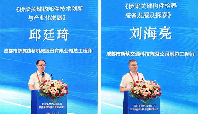 上午開幕式后,由院士、大師和行業專家帶來了6場內容豐富、頗具價值的主題報告,其中新筑交科作為主題報告中唯一的企業單位,由總工程師邱廷琦分享了《橋梁關鍵構部件技術創新與產業化發展》主題報告。同日下午多位橋梁專家、大學教授和企業專家進行了11場專題報告,其中新筑交科副總工程師劉海亮分享了《橋梁關鍵構件檢養裝備發展及探索》。